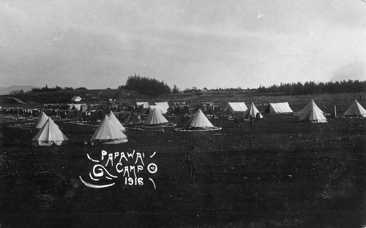 Tauherenikau Camp was on a farm near the Tauherenikau River. The men lived in tents and there were few buildings. It was noted for the stony ground. After Featherston Camp opened, Tauherenikau was used as a temporary site. In the winter of 1917 a four-camp system was on trial to prevent infection spreading among recruits. The C.1 Camp was moved to Tauherenikau in late 1917 and over 3,000 men had spent time there by war’s end, with half progressing to the proper army. A feature of the camp was the decorative stonework made by soldiers. After the war a farm training camp for returned soldiers was on the site until 1923.