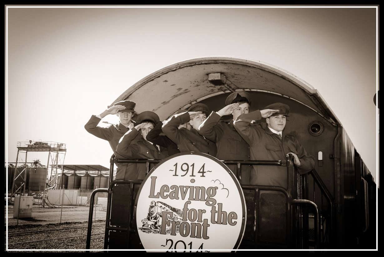 The “Leaving for the Front” re-enactment was a great success, with over a thousand locals taking part in farewelling a group of young men who represented those who left on 13 August 1914. Speechs were delivered at the Town Hall, soldiers marched, bands played, young women kissed the soldiers and waved handkerchiefs at them, and the saluted the crowd as the train pulled out. It was a very successful start to the WW100 commemorations locally, and well supported by local and national media.